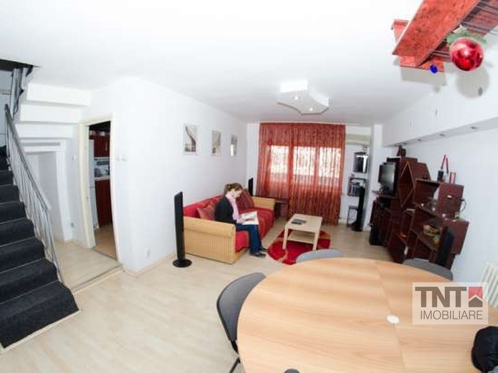 TNT-Imobiliare va ofera apartament pentru inchiriere cu 3 camere, situate pe 2 niveluri. La etajul de jos se afla living-ul, o baie, o camara, bucataria, un balcon inchis si o terasa mare descoperita. La etaj se afla doua dormitoare (unul cu un pat matrimonial si unul cu o canapea extensibila), un dressing, un hol mare, un balcon si o baie.