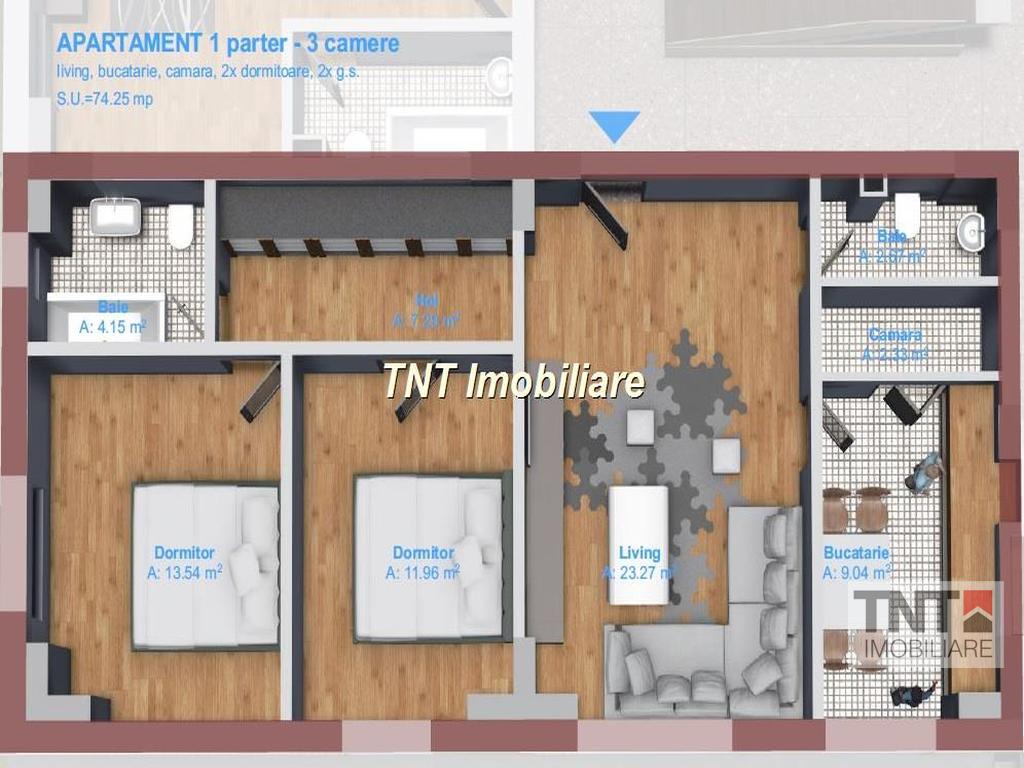 Apartament nou 3 camere decomandat cu o suprafata utila de 74.25 mp si predare la cheie in toamna anului 2014 cu urmatoarele finisaje si dotari: