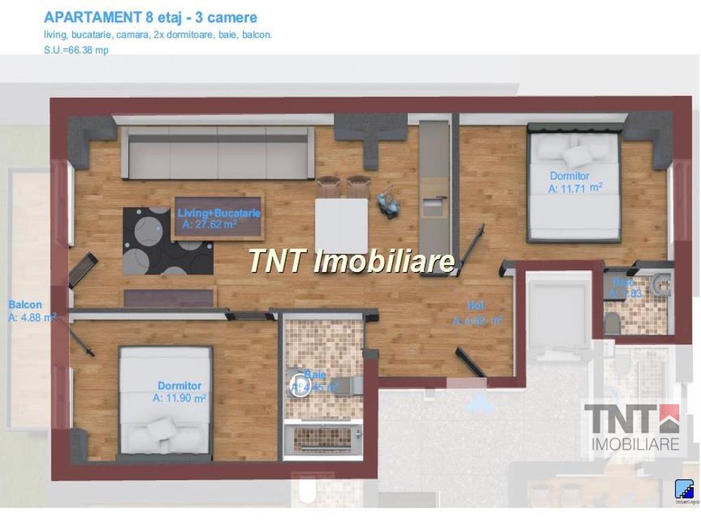 Apartament nou 3 camere semidecomandat cu o suprafata utila de 66,5 mp si predare la cheie in toamna anului 2014 cu urmatoarele finisaje si dotari: