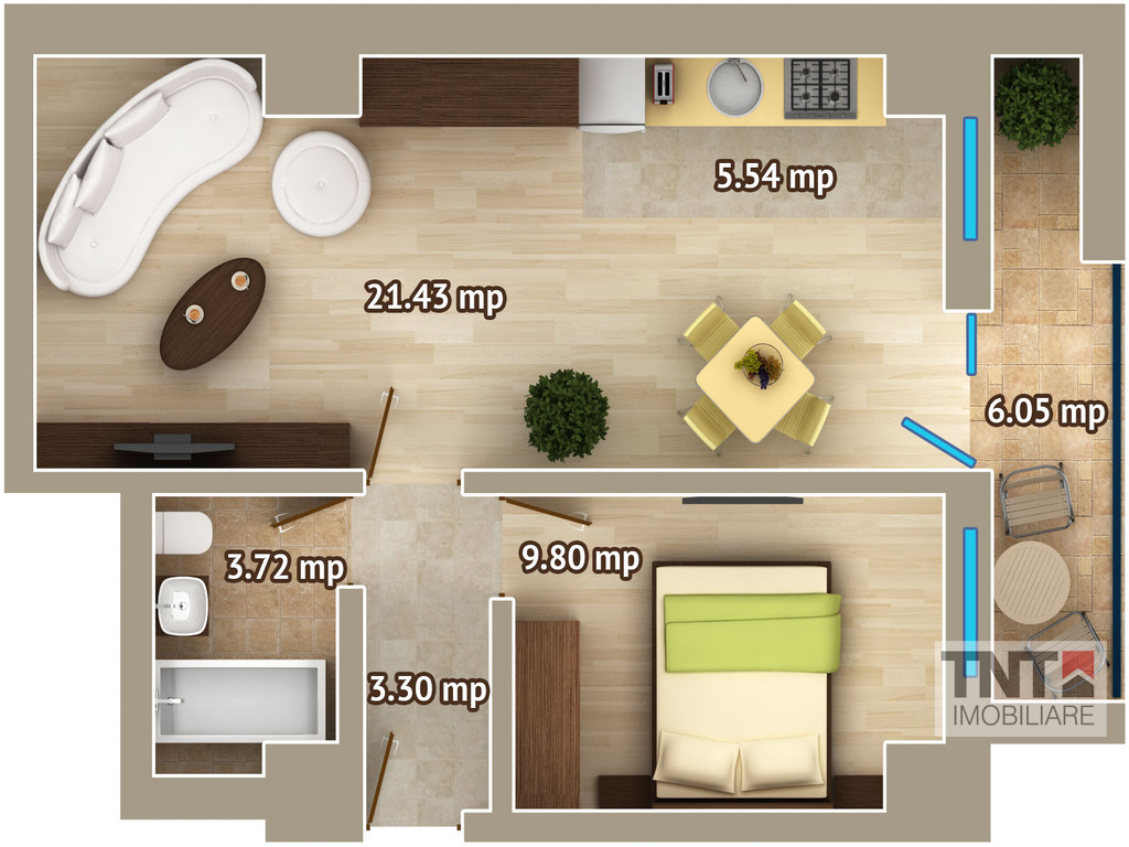 Apartament nou 2 camere, suprafata utila totala de 50 mp din care 6 mp terasa, cu predare finisat la cheie de lux in vara anului 2015.