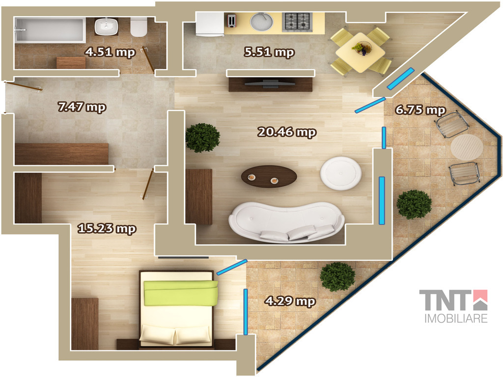 Apartament nou 2 camere, suprafata utila totala de 64 mp din care 11 mp terasa, cu predare finisat la cheie de lux in vara anului 2015.
