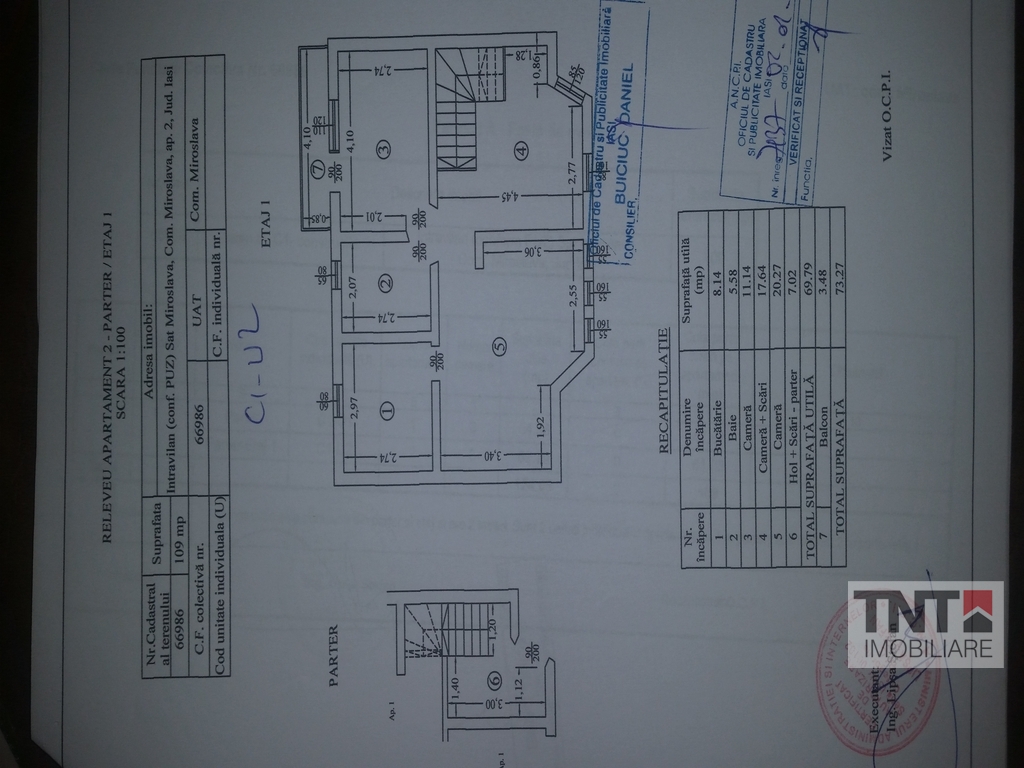 Apartamentul este compus din 3 camere decomandate cu o suprafata de 73 mp. si este situat la etajul 1.