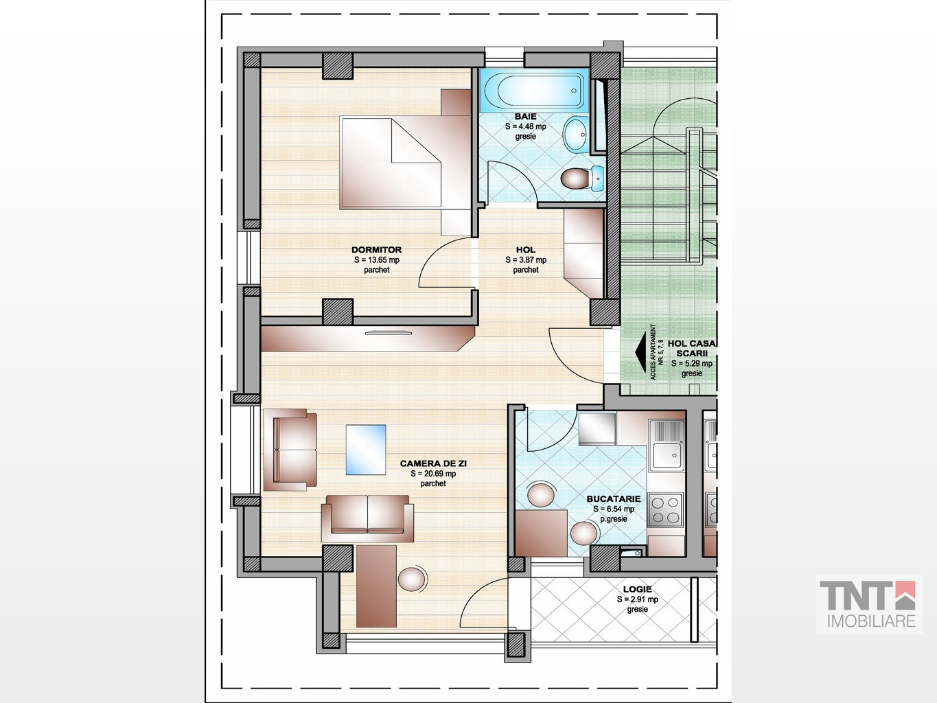 Apartamentele disponibile pentru acest proiect au o suprafata utila de 52 mp utili si sunt compuse din : Baie cca. 4.5 mp , Bucatarie cca. 7 mp, Dormitor cca. 14mp, Camera de zi cca 21 mp si balcon cca. 3mp.