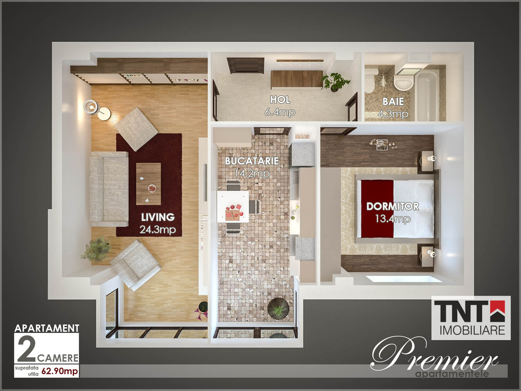 APARTAMENTUL CU 2 CAMERE – tip 2- are o SUPRAFATA de 63mp.Acesta are o serie de UTILITATI de nivel inalt ca:instalatie electrica din cupru Schneider Germania, centrala termica proprie Ariston si chiar contoare de gaz, apa si energie electrica individuale.In plus avem interfon si cablarea pentru TV si telefon gata realizata, avand insa si posibilitatea de a adauga si aer conditionat(optional).Pentru un grad de confort ridicat se foloseste incalzirea prin pardoseala in cardul bucatariei-aducand ca beneficiu ridicarea nivelului de utilitate in cadrul acestei zone.