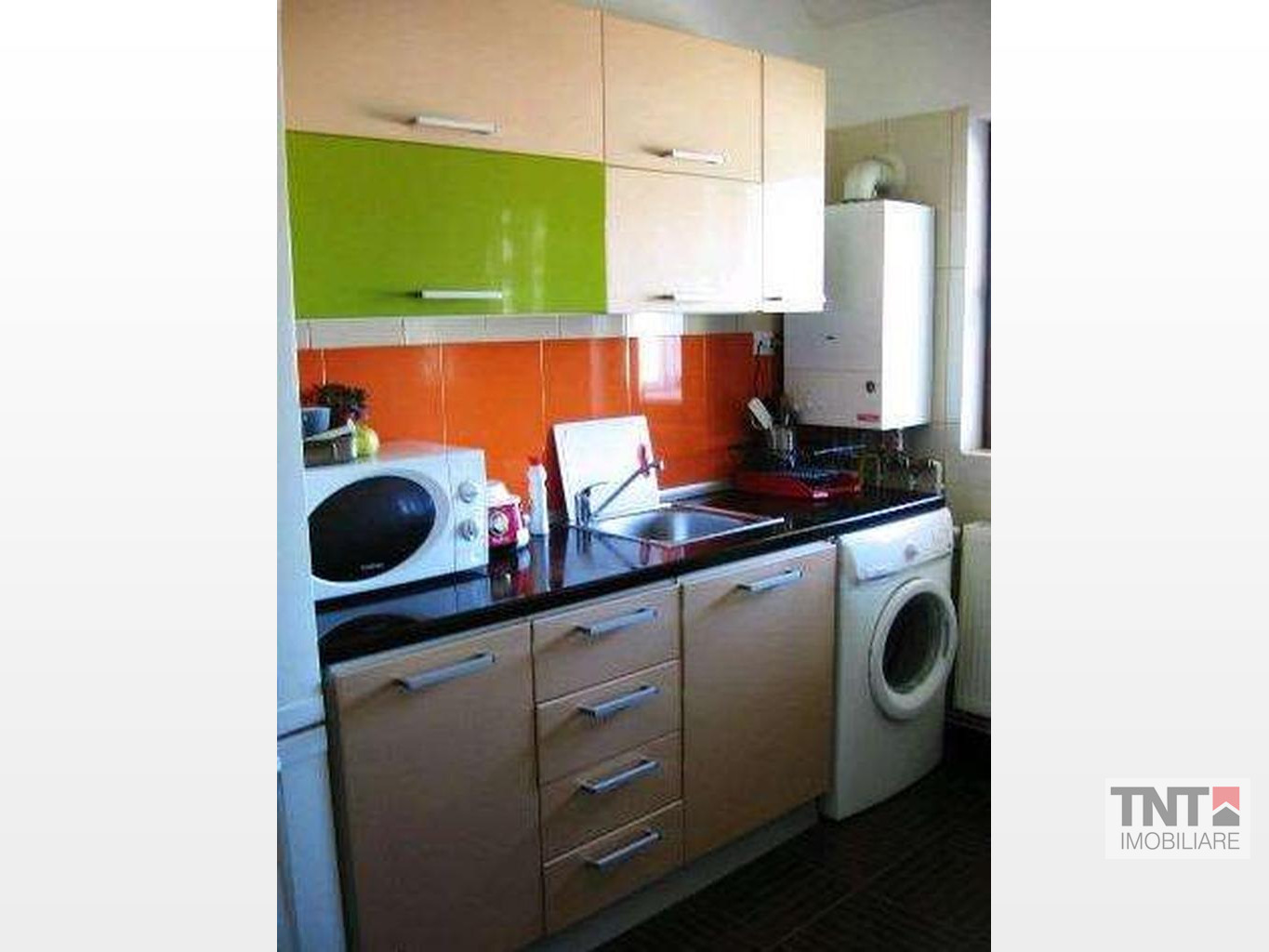 Are amenajari interioare de foarte buna calitate, gresie si faianta la baie si bucatarie, gresie pe hol si in balcon, parchet in ambele camere. Este mobilat cu mobila noua, masina de spalat noua, are frigider si aragaz, centrala termica pe instalatie de cupru, termopan (inclusiv la balcon), usa de metal la intrare. Foarte luminos si foarte calduros, avand costuri minime iarna la caldura. Se poate vinde mobilat.