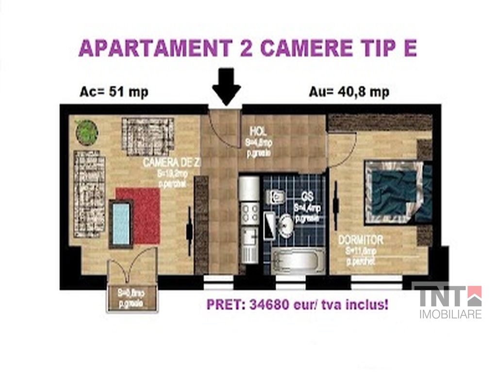 Apartament semidecomandat cu suprafata utila de 42 mp, are urmatoarele dotari: