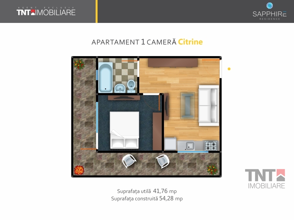Apartamentul cu 2 camere- CITRINE-are o SUPRAFATA construita de 54,28mp si utila de 41,76mp si beneficiaza de o serie de UTILITATI ca: centrala termica proprie,cablare Tv si telefon gata realizate.In plus pentru ca stim cat de importanta este siguranta unui camin calduros – Sapphire residence aduce in prin –plan sistemul ultra-modern de incalzire prin pardoseala- renuntant astfel la incalzirea clasica ce nu numai ca ocupa spatiul util din apartament dar si lasa de dorit la nivel estetic.