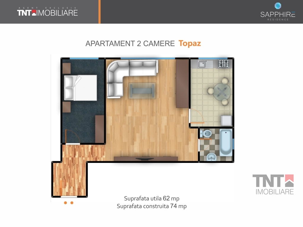 Apartamentul cu 2 camere- TOPAZ-are o SUPRAFATA construita de 74 mp si utila de 62 mp si beneficiaza de o serie de UTILITATI ca: centrala termica proprie,cablare Tv si telefon gata realizate.In plus pentru ca stim cat de importanta este siguranta unui camin calduros – Sapphire residence aduce in prin –plan sistemul ultra-modern de incalzire prin pardoseala- renuntant astfel la incalzirea clasica ce nu numai ca ocupa spatiul util din apartament dar si lasa de dorit la nivel estetic.