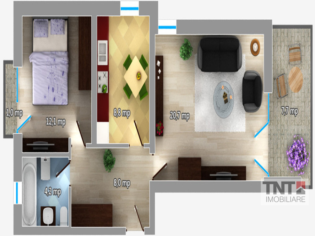 Acest apartament de doua camere are o COMPARTIMENTARE clasica,total decomandata si are o SUPRAFATA TOTALA UTILA de 62,5 mp.Acesta beneficiaza de un set de UTILITATI ce intra in pretul acestuia:centrala termica proprie,contoare individuale deja instalate pentru gaz,apa si electricitate(instalatia termica fiind ingropata) si chiar video-interfon.Bineinteles, racordirile pentru bucatarie si cablarea pentru Tv si telefon sunt adaugate.Spre deosebire de alte apartamente noi putem mentiona ca acesta aduce beneficiul echiparii integrale– bucurandu-ne astfel si de aer conditionat si chiar de instalitie electrica completa(fiind deja instalate chiar si corpurile de iluminat).