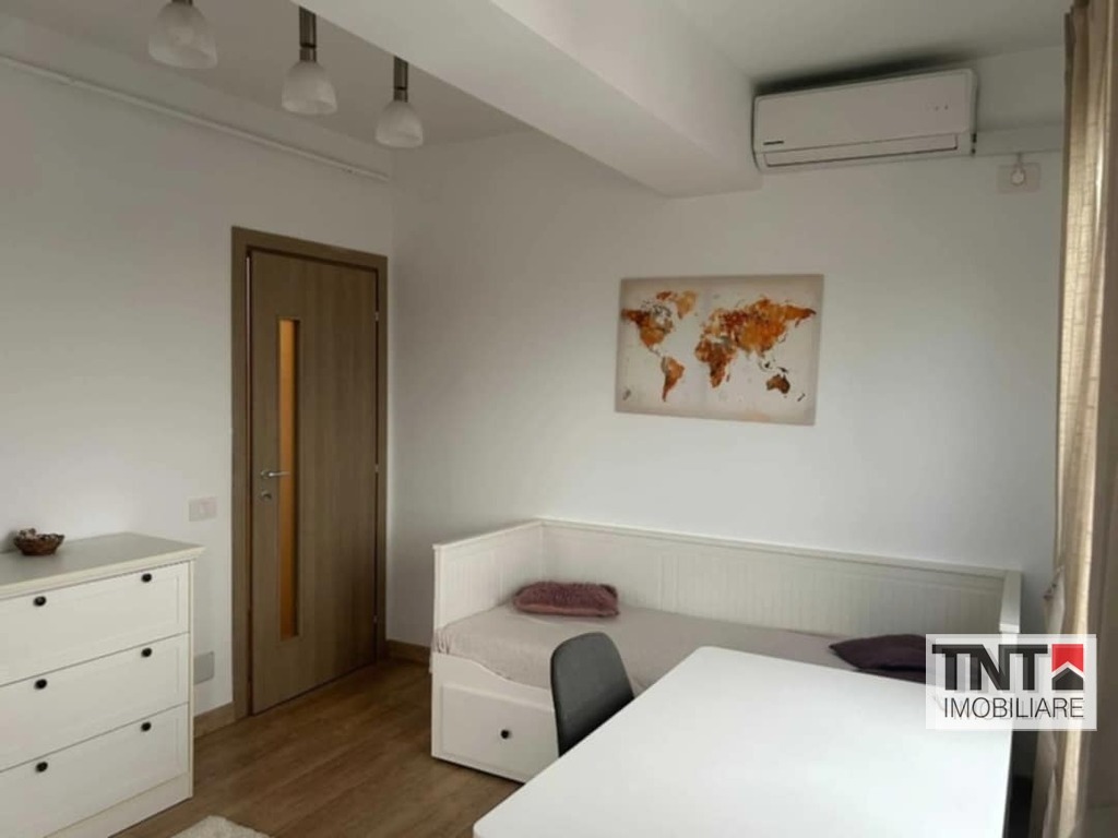 Living spațios, (open space) dotat cu canapea extensibilă și alte obiecte de mobilier, iar dormitorul cu pat dublu, birou și scaun de birou, dressing.