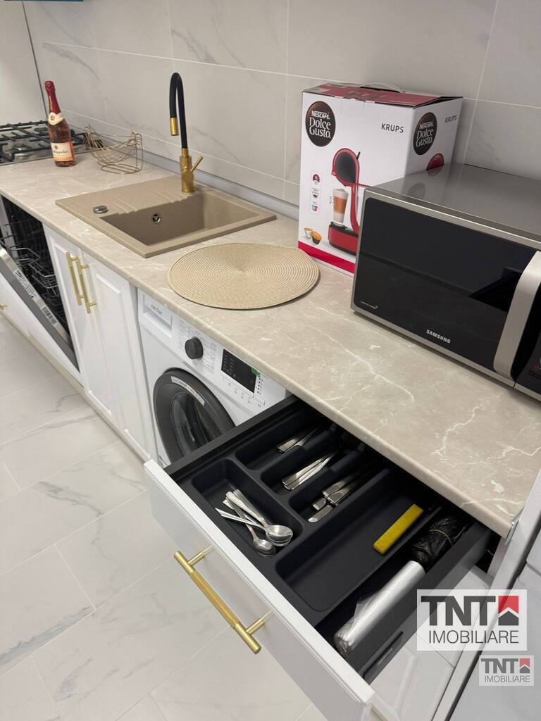 Electrocasnice complete: mașină de spălat vase, plită, cuptor, frigider, cuptor cu microunde, mașină de spălat haine.
