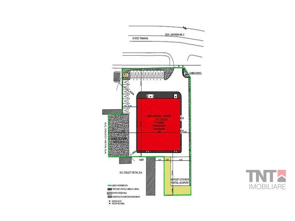Depozitul interior - inaltime 6 m la streasina, 8 m la varf, pardoseala epoxidica, rafturi metalice pentru 200 de paleti, birou, trape, incalzire. Depozitul exterior cu suprafata 400 mp, gard si poarta de 6 m deschidere. Teren de sport mutivalent.