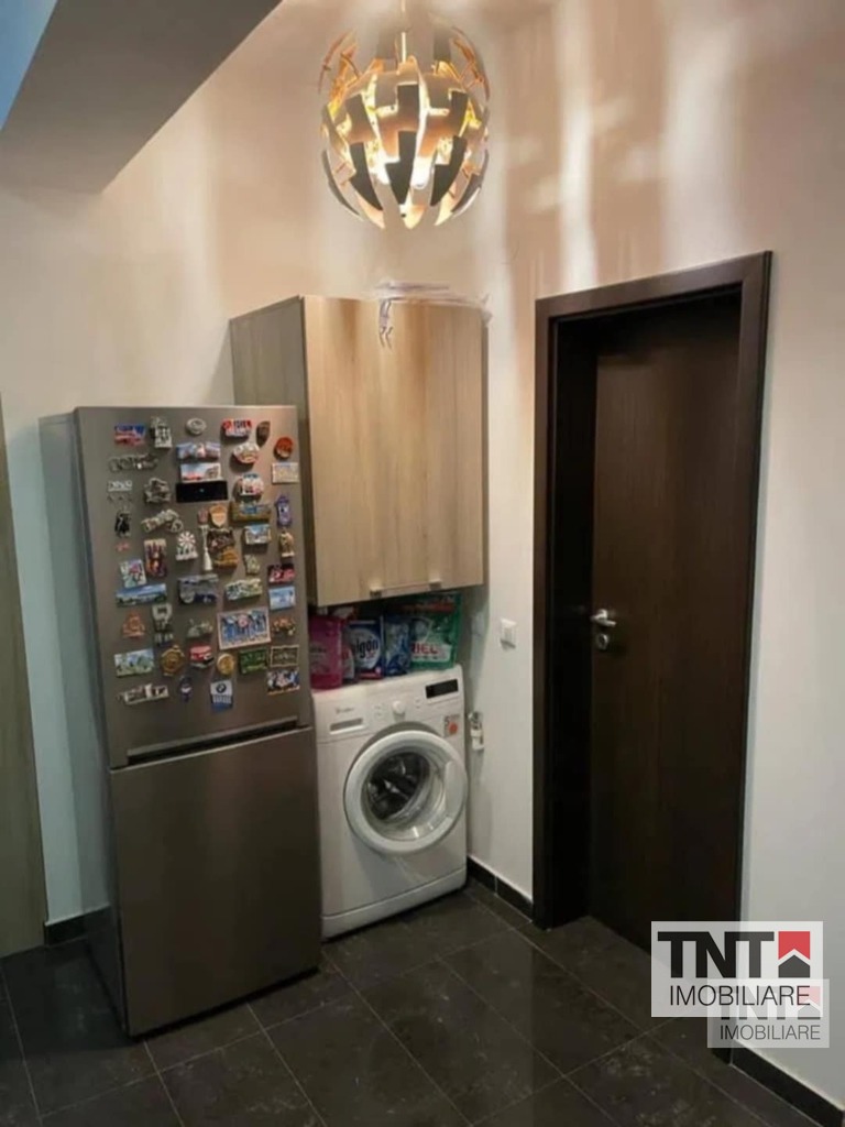 Apartamentul este mobilat si utilat complet: centrala termica, cuptor electric, plita pe gaz, hota, masina de spalat, combina frigorifica, doua dressing-uri (unul mare situal pe hol, iar unul mediu in dormitor), pat matrimonial, televizor, aer conditionat.