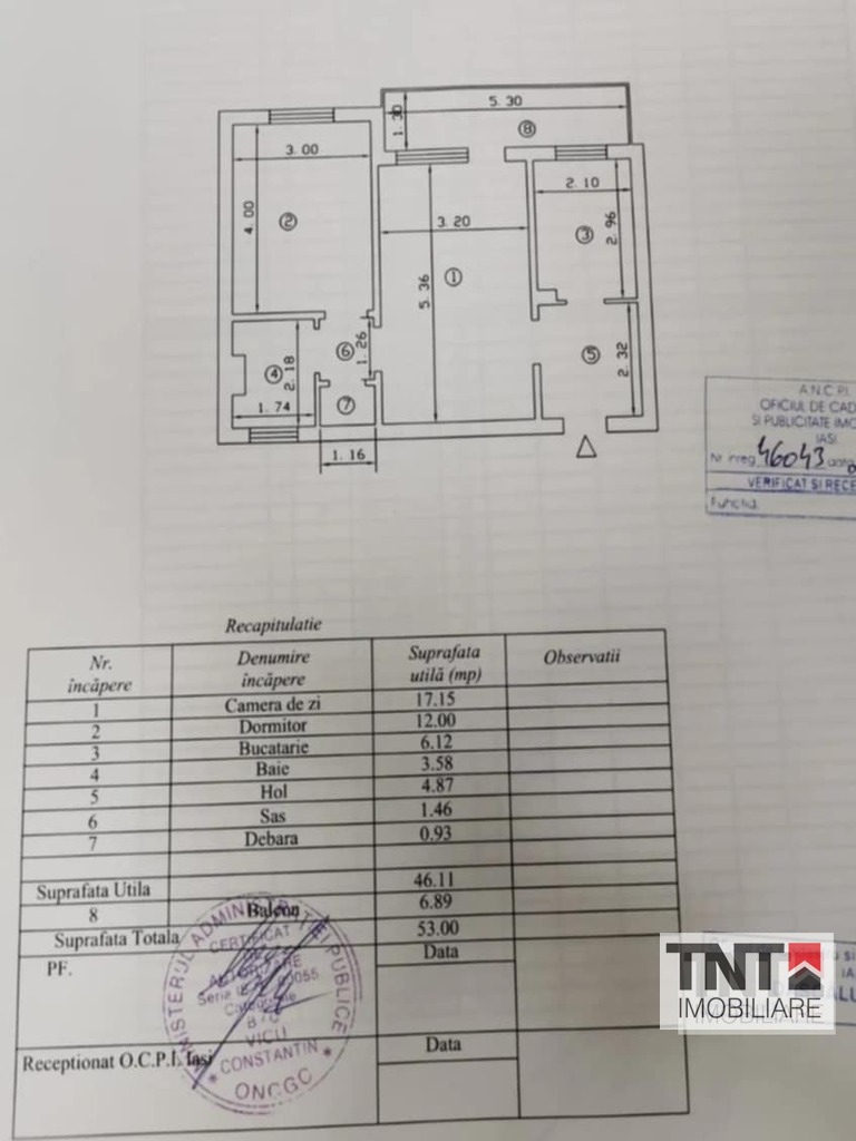- suprafața utilă: 46 mp +balcon închis cu termopan, 6,9 mp, total 53 mp.